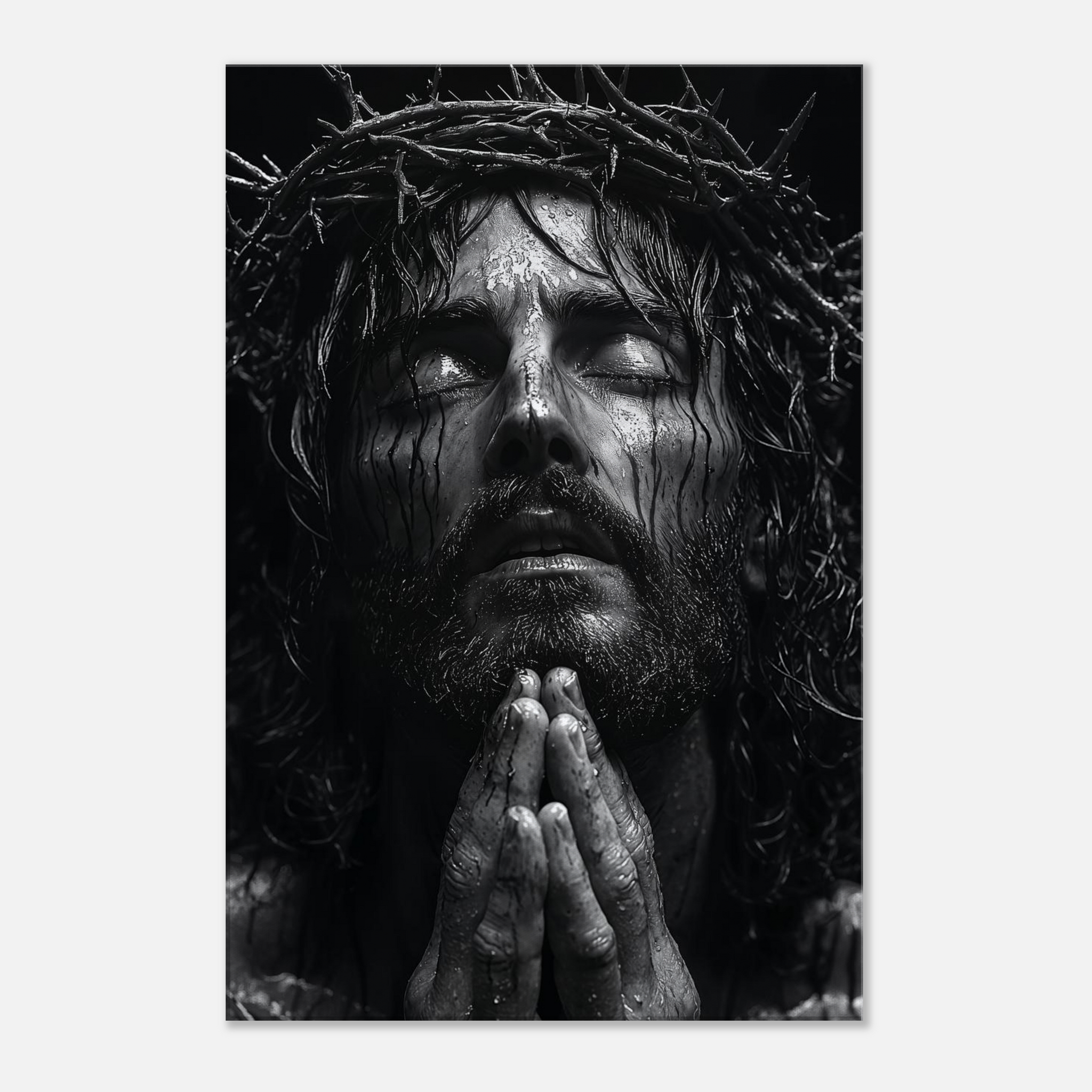 Rendered in stark monochrome, the composition strips away all context and comfort. What remains is the interior battle: faith held steady under unbearable pressure, devotion sustained without reassurance.