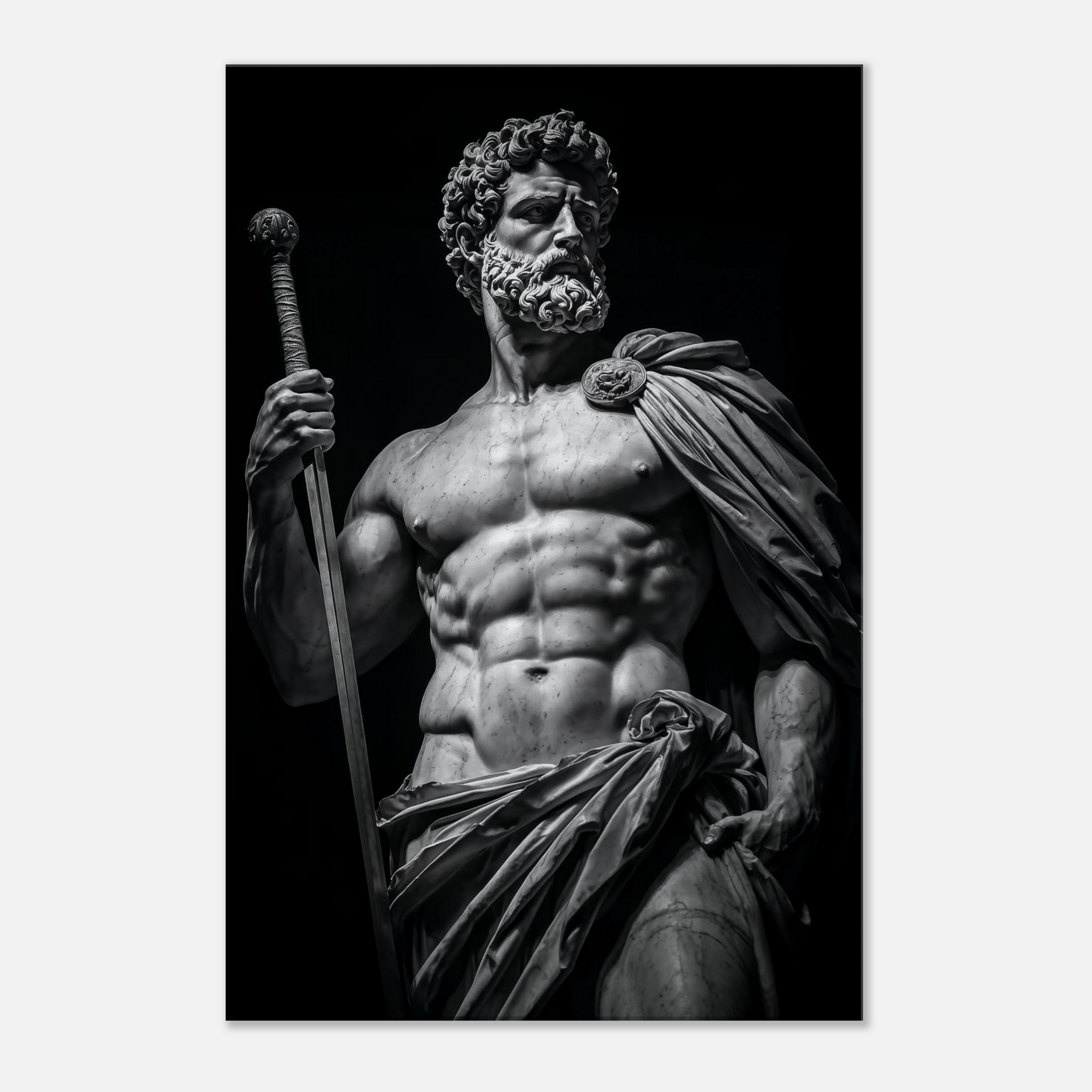 Rendered in stark monochrome, the sculpture emphasizes form, control, and permanence. Muscle is present, but never indulgent. The staff is held, not wielded. Everything in the composition speaks to command exercised inward before it is exercised outward.